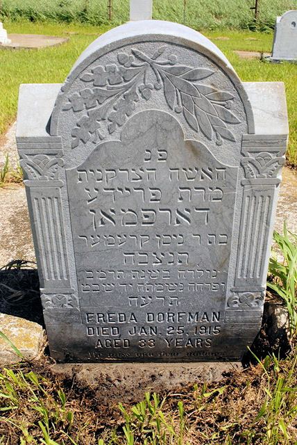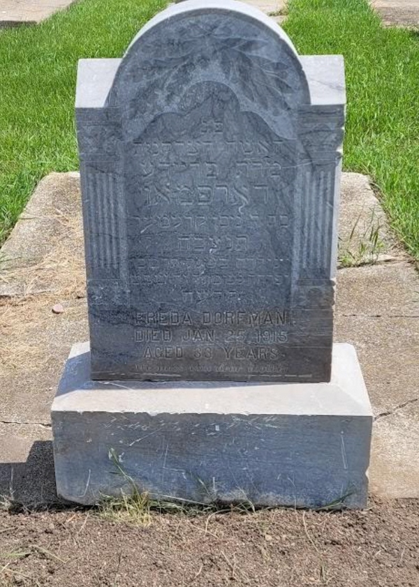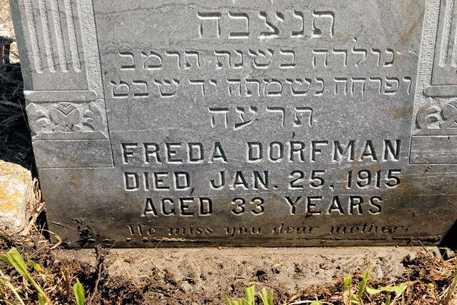 (Here Interred / The Righteous Woman / Ms Freda / Dorfman / daughter of Mr Nisan Kremer / TNZBH [May her Soul be Bound up in the Bond of Life] / Born in the Year 642 / Her Soul Departed 14 Shevat / 675 [AM 5675])